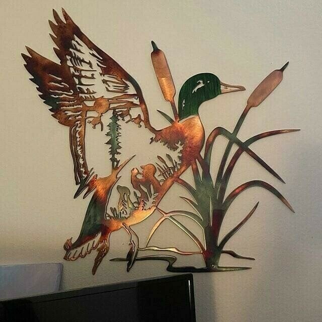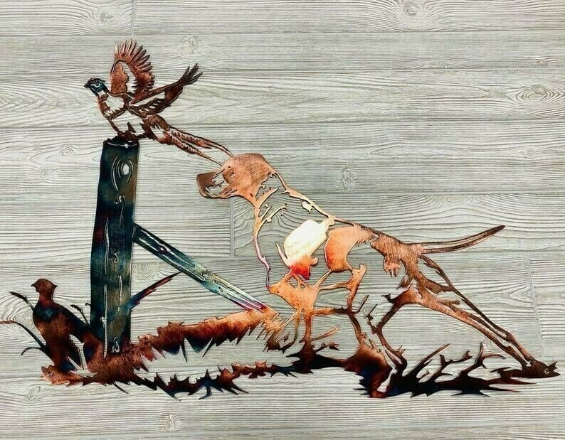 This very artistic art work depicts a peaceful hunting scene with a hunter and his lab calling in ducks all within the outline of a very detailed mallard profile. Patina etched in a tints of black, copper and green to bring the scene to life. This is a great selection for the bird hunting enthusiast.